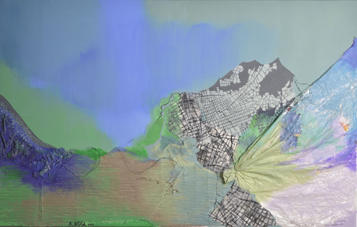 Los materiales se pegan, se enrollan, se cosen y se fijan a la tela. Por ejemplo: material de embalaje, tejido, baldosa, cuerda, alambre, madera, cartones, plástico y cable. Cada parte individual se adapta, se cambia y se transforma en nuevos motivos con el fin de crear paisajes Entrelazo la técnica del collage con la pintura. Pintar.